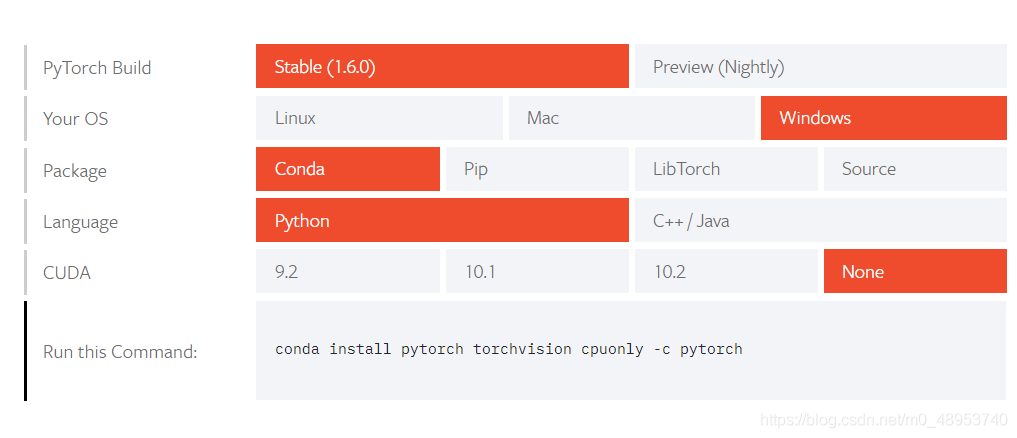 然后进入官网,https://pytorch.org/get-started/locally/,根据自己机器的情况进行选择,得到安装指令。