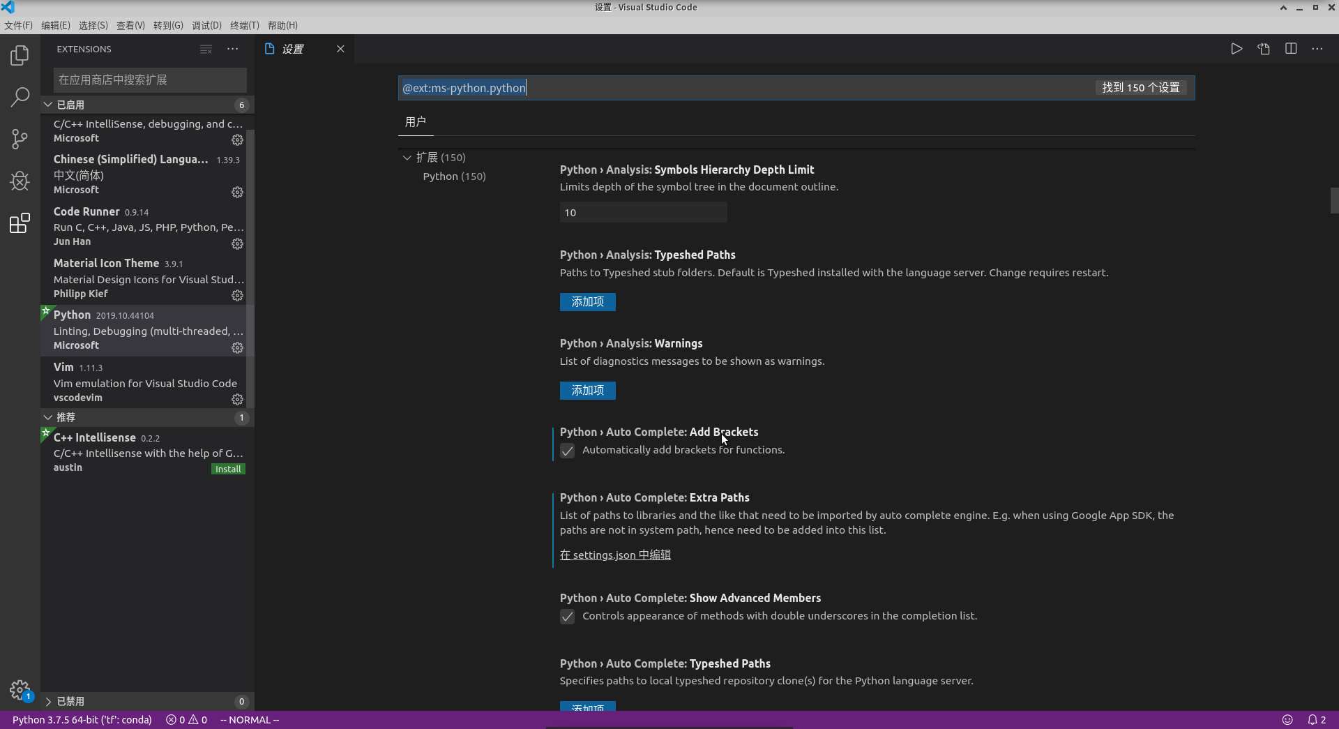 由于linux各发行版的安装方式都不同,因此这里不详细描述安装过程了。对于我使用的ubuntu19.10来说,从vs code官网下载.deb 包,然后终端运行