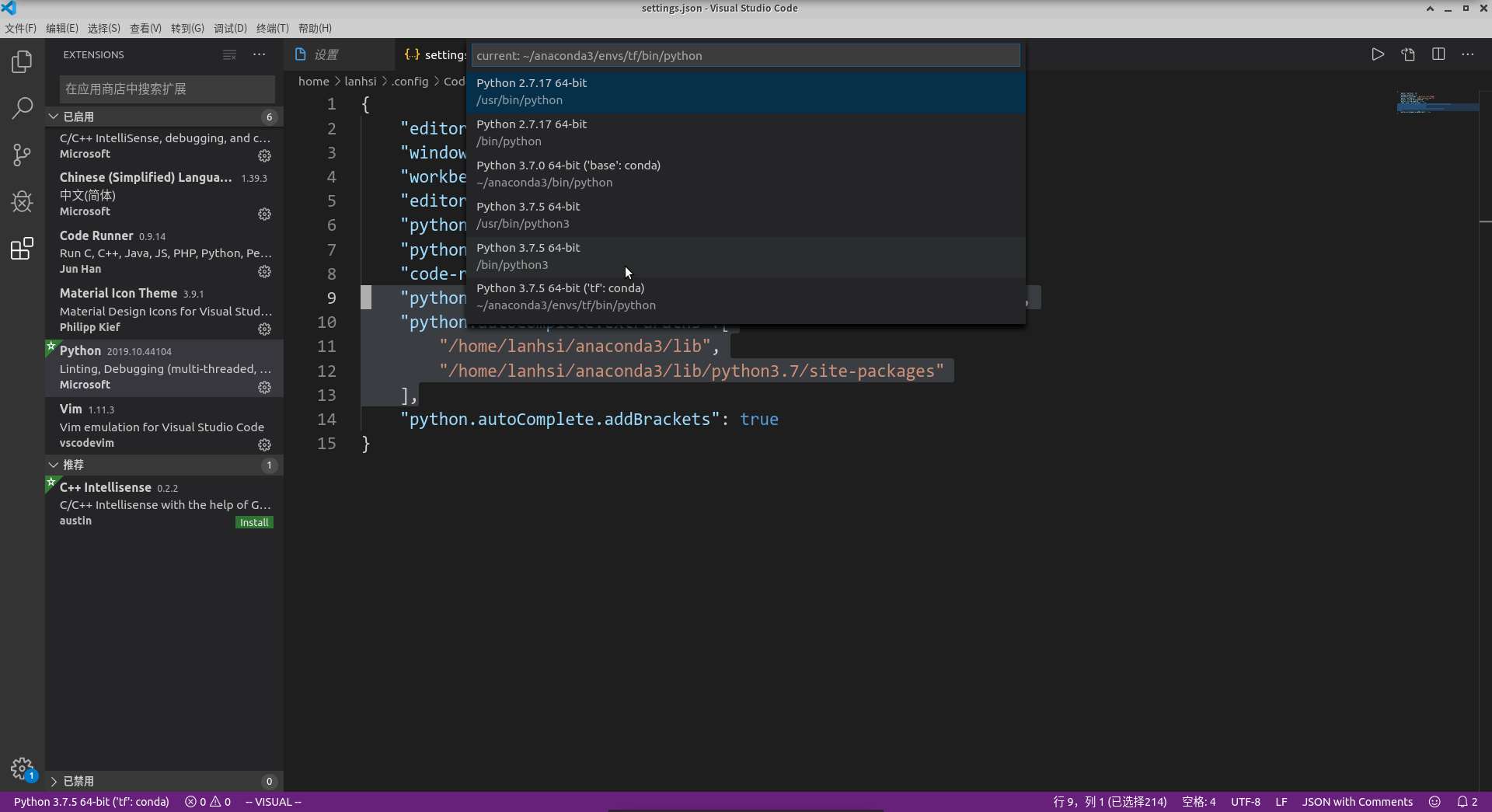 图中选中的三行是我们需要添加的信息。这几行中,第一行自定义了一个Python解释器,将其设置为anaconda带的python解释器;后面几行配置了Python自动补全的路径,相当于是include了这些目录中的文件,这样VS CODE就可以读取到tensorflow,方便自动补全。同样,记得将路径中的lanhsi换成你的用户名。