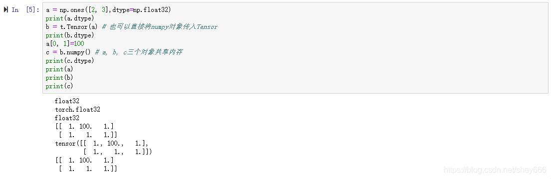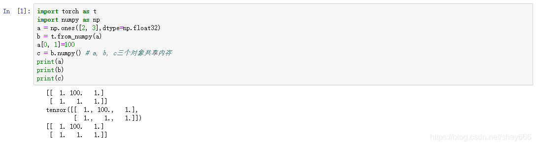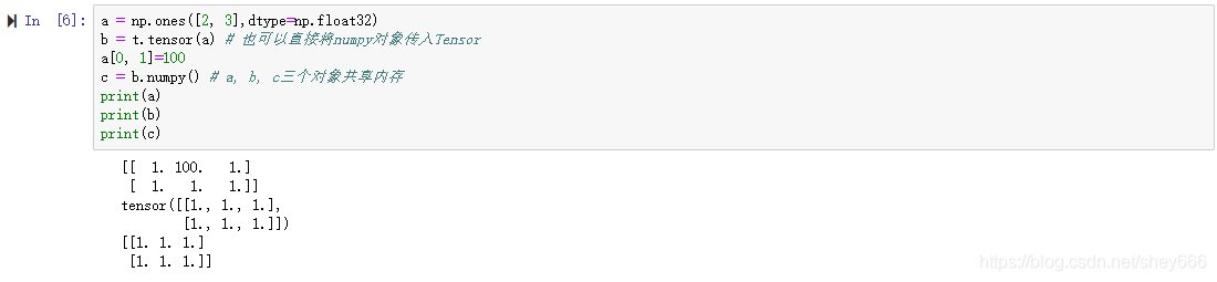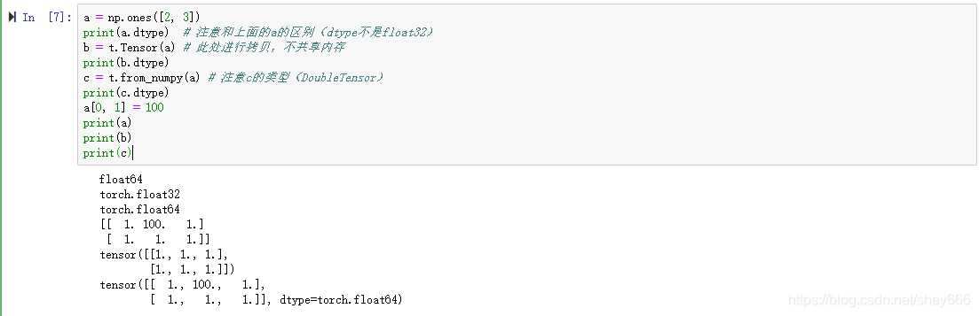 需要注意的情况:使用t.Tensor()进行转换,发现Numpy的数据类型和Tensor的类型一致,因此共享内存