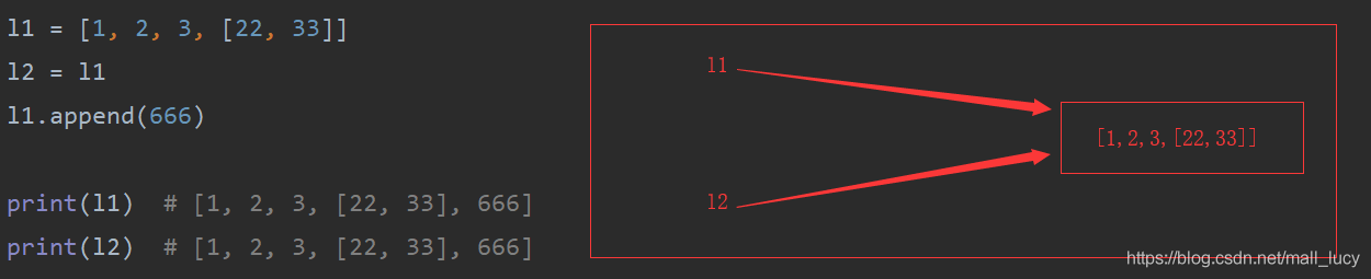 l1 = [1, 2, 3, [22, 33]] l2 = l1 l1.append(666) print(l1) # [1, 2, 3, [22, 33], 666] print(l2) # [1, 2, 3, [22, 33], 666]