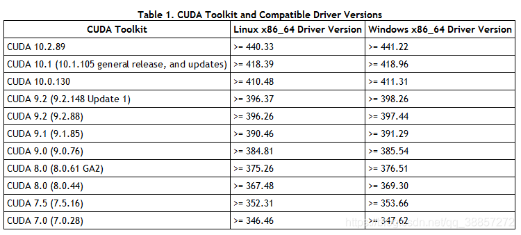 可以看到最开始有个数字,这个就是驱动版本,和cuda会有下图类似的关系,由于cuda和驱动会不断更新,后面安装的同学,可以去google一下,《cuda和nvidia驱动的对应关系》,获取最新的信息。