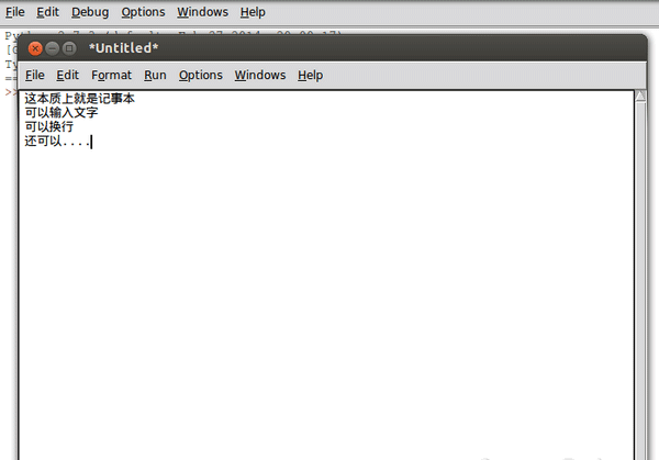 这样,就出现了一个新的操作界面,在这个界面里面,看不到用于输入指令的提示符:>>>,这个界面有点像记事本。说对了,本质上就是一个记事本,只能输入文本,不能直接在里面贴图片。