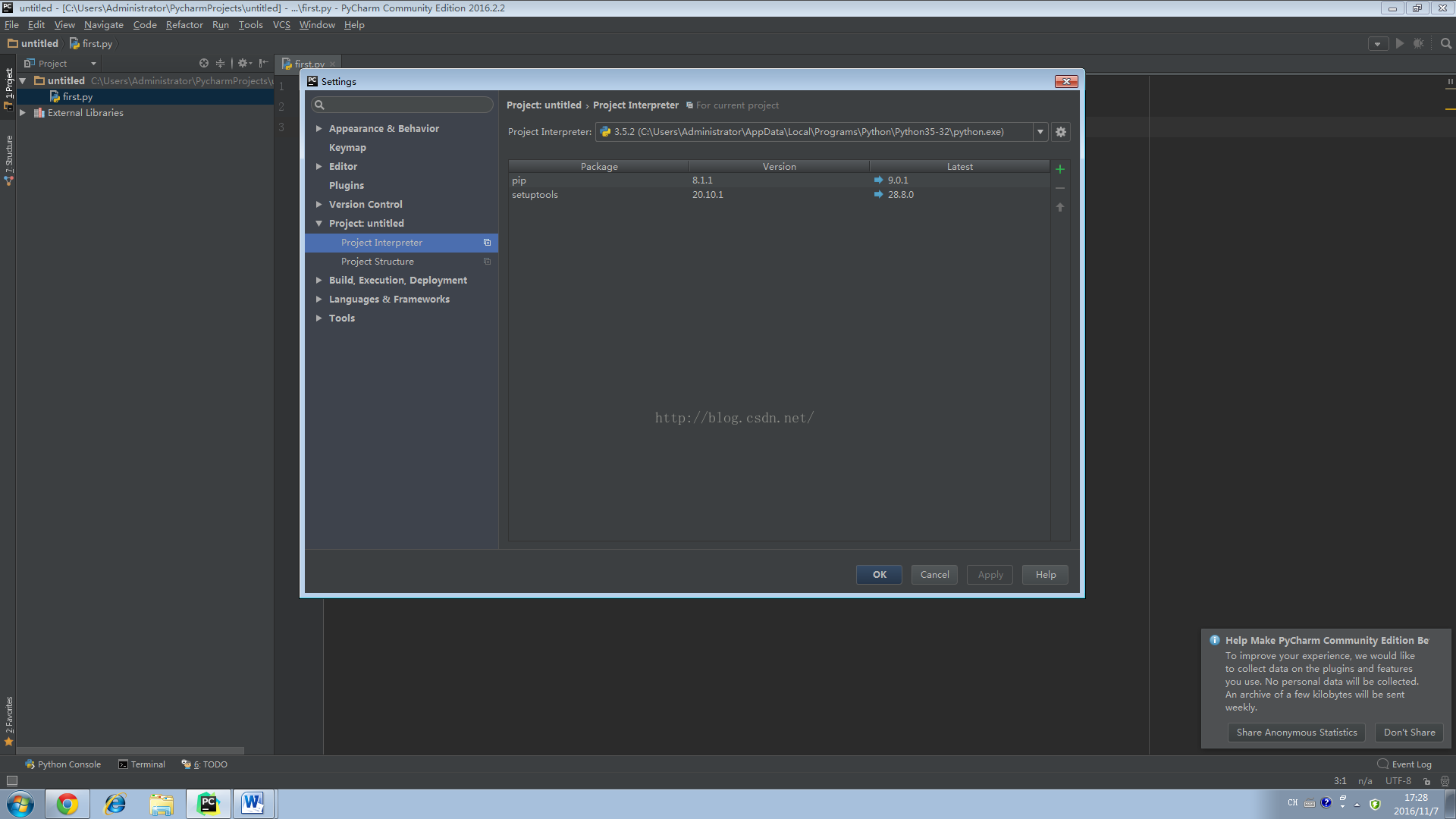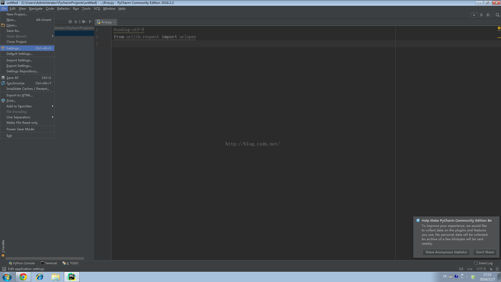 首先我们进入pycharm的主界面,单击file-〉settings-〉Project:untitled-〉Project Interpreter,如下图: