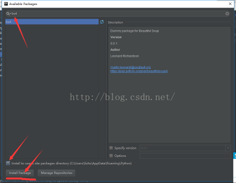 这时我们在搜索框中输入“bs4”,然后选择列表中的bs4,然后进行安装,如下图: