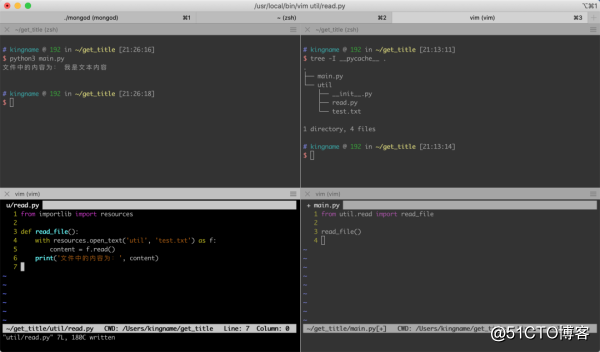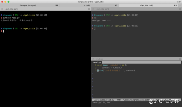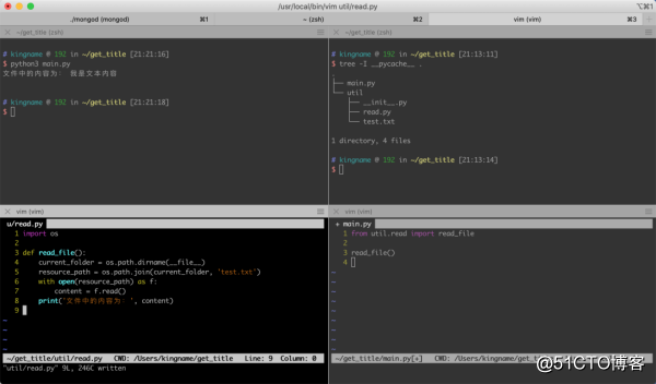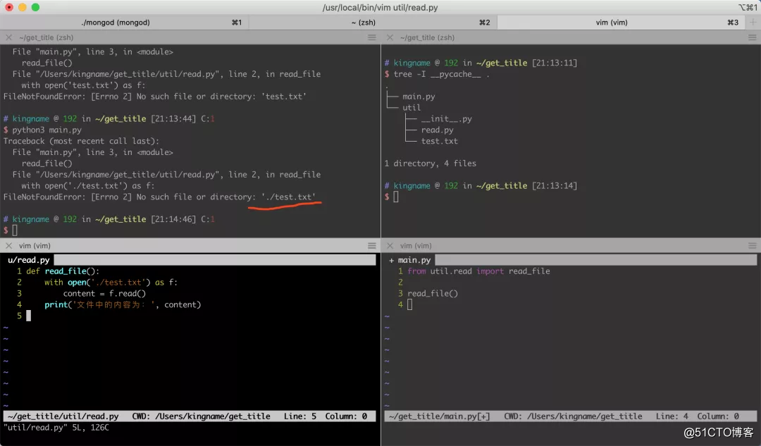 可以看到,现在Python 已经找不到这个文件了。这是因为,我们的入口程序在 ~/get_title文件夹中,而test.txt文件在~/get_title/util文件夹中。因为我们运行的是main.py,所以 Python 会在~/get_title文件夹里面寻找test.txt,自然就找不到了。