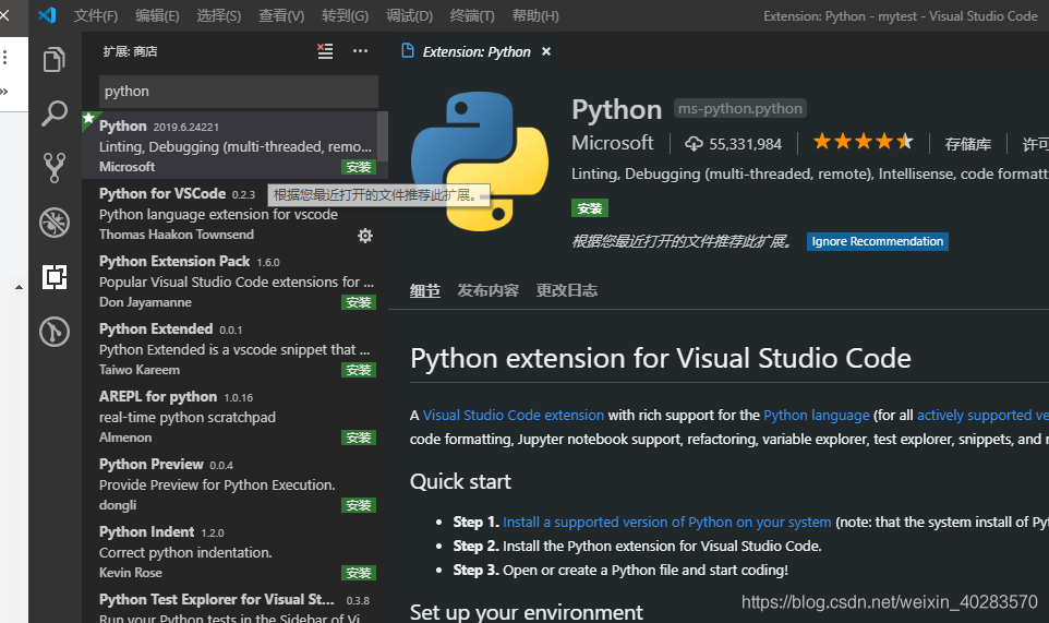 为VS Code安装Python扩展。Python扩展名为Python,由Microsoft发布。