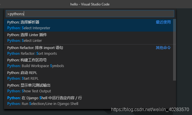 打开命令选项板(Ctrl + Shift + P)选择Python 3解释器,开始键入Python:select inter命令进行搜索,然后选择命令。