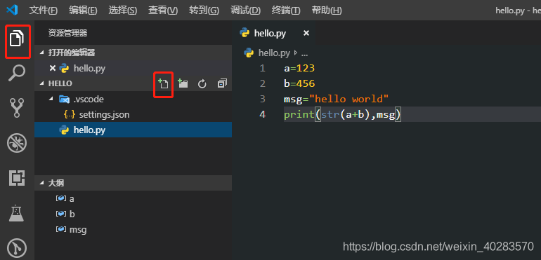 从文件资源管理器工具栏中,单击文件hello夹上的“新建文件”按钮: