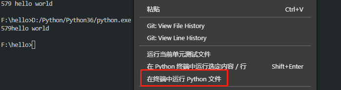 hello.py使用Python 运行很简单。在编辑器中单击鼠标右键,然后选择“在终端中运行Python文件”(自动保存文件):