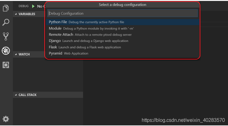 这里我们选择Python File,这是使用当前选择的Python解释器运行编辑器中显示的当前文件的配置。选择后,Python扩展会launch.json根据您的选择创建并打开包含预定义配置的文件。