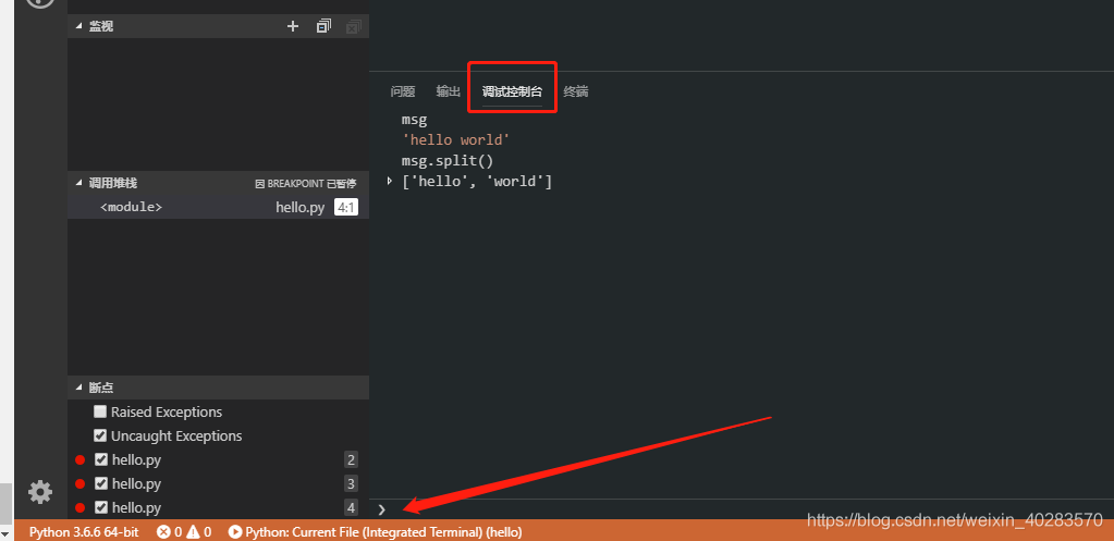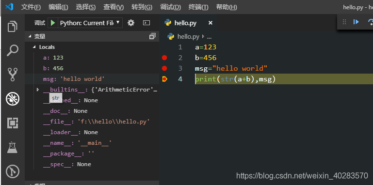 切换到hello.py编辑器,然后通过选择“调试”工具栏中的箭头或按F5运行调试器。调试器在文件断点的第一行停止(如果stopOnEntry设置为true,则停在第一行)。当前行在左边距中用黄色箭头表示。