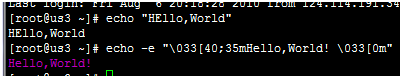 echo –e “33[40;35mHell,world33[0m"
