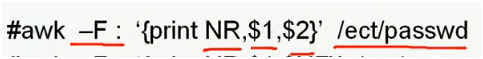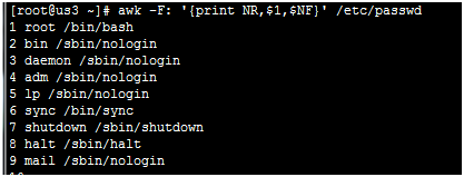awk –F : ‘{print NR,$1,$NF}' /etc/passwd $NF 提取最后一行
