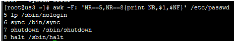 awk –F: ‘NR==5,NR==8{print NR,$1,$NF}'/etc/passwd 指定5-8行