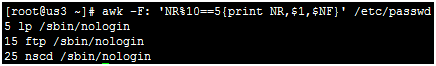 awk –F: ‘NR%10==5{print NR,$1,$NF}'/etc/passwd 除10求余