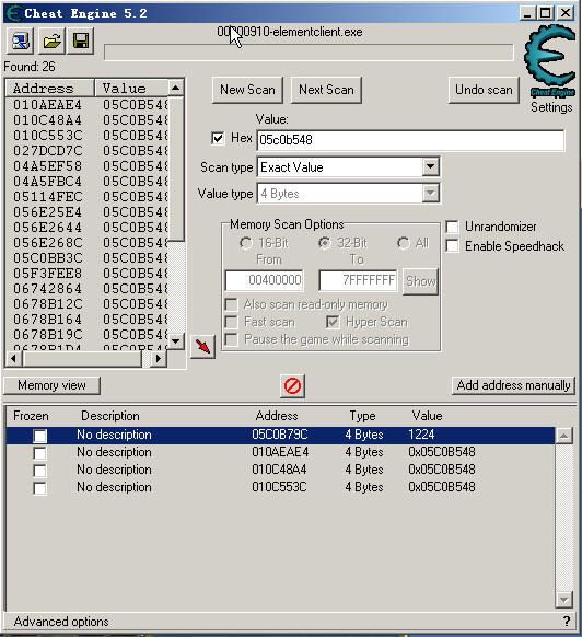 得到26个地址都含有这个数,好的,把最前面的三个数保存到下栏里,然后,小退一下(回到人物选择界面,再进入游戏),就可以看到,三个地址的数值都有变化了.好,再重新执行上面的找血量地址,得到ESI的值,记下来,对比刚保存 下来的三个地址内的数,呵呵,发现