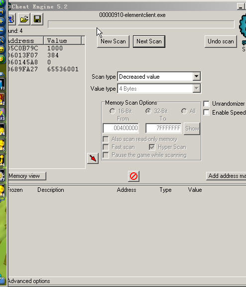 搜到N个址,好,再回到游戏里,我们让人物掉点血(打怪什么的,最好多掉点,这样方便后面来查数),再用"Decreased Value"(减少了的数)来搜,这样掉点血,搜一次,搜点血搜一次,几次下来,好的,找到的地址就只剩四个了(我是两次就找到只剩四个了,电脑不同,可能找的次数也不同,不过方法是一样的,先找最大血量值,然后,再掉点血,再用减少的搜,如此循环几次就OK了)记下第一个地址(为什么用第一个地址,CE的教程里说,一般如果找到少量的地址后,正确的一般在第一个,如果你不确定,你可以让人物自动回血,就可以看到,第一个地址的数也在跟着增加:)~)
