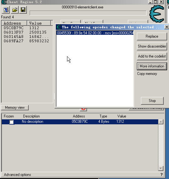 可以看到,是把ECX的值写入ESI+00000254这个内存地址中,所以,我们记下下面的ESI地址:ESI=05C0B548,再回到CE主界面,搜"05C0B548"这个数(选中HEX,用十六进制四字节方式搜)