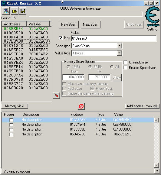 记下ESI的值,010AEAC0,再回到CE主界面,用十六进制的方法找010AEACO