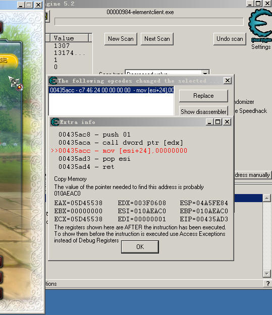 接着,把第一个地址双击,加入下面的栏里,再在地址上单击右键,弹出菜单中选"Find out what writes to this address"(谁在改定这个地址),调出监视窗口,再回到游戏,掉点血,就可以看到监视窗口里己经有改写该地址的命令了~