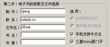 4、设置你所将要制作的电子书的各项属性,制作——即可填写你自己的ID、联系——可填写你的邮箱地址或者主页地址、文件名——为你所制作出的电子书的名称(可为中文,但是需要你的手机能够识别,个人建议使用英文比较适合所有手机)、书名