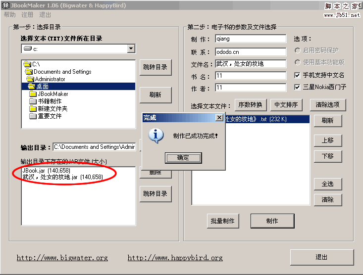 说明:这是一个类似于白痴的教程,也就是说,即使你完全是个电脑盲,只要你想做JAR格式电子书,你按照这个上面的来,肯定是可以做成功的。如果你是高手,那自然不必我说,其中要注意的两点,1、制作材料——也就是原始的TXT格式电子书必须是Unicode编码;2、你所制作的电子书的书名和作者名最好是英文字母。这两点是比较容易导致你制作成功,拷贝到手机里,却无法阅读的原因。