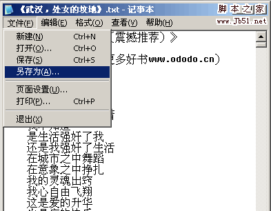 2、一般情况下,这种txt格式文件都是以ANSI编码存档,这是默认编码。但是JAR格式电子书需要Unicode编码的TXT文件,我们可以用另存为的方式将ANSI编码txt格式文件,转换成Unicode编码TXT文件。因此,我们先打开你要制作的TXT格式书籍,选择“文件”“另存为”,如图: