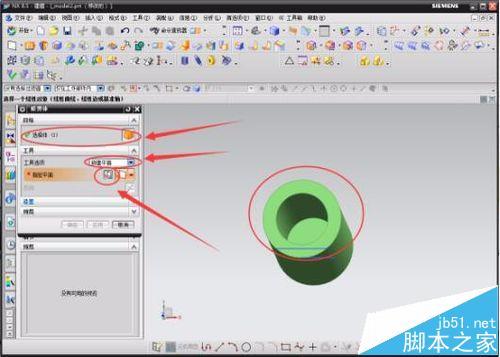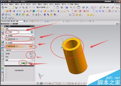 6 、得到圆杯模型后,继续再修改一下其他的形状(说明一下,这里的修改只为了操作建立其他模型时都会用到的一些方法,并不是按照常规模型去做,之探究创建手法,不谈论外观)。点击工具栏中“修剪体”的小图标或者在“插入”中选择修剪体都可以,在“工具选项”中选择“新建平面”,点击“指定平面”后的小图标,进入到下一个修剪方法中。在弹出来的数据设置框中选择“两直线”的修剪方式,分别在“第一、第二条直线”中点击其后面的小图标,并选中模型草图中的两直线,确定好修剪的方向,最后点击“确定”,完成了“修剪体”的操作。