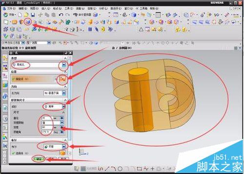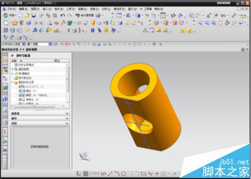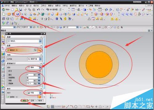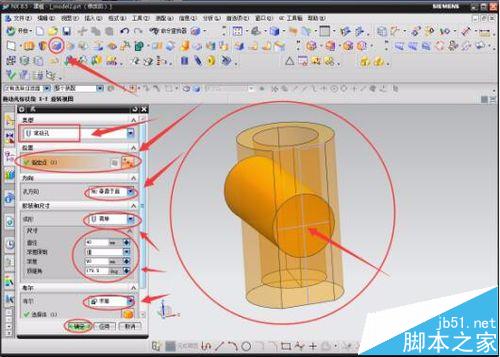 5 、最后对得到的模型进行钻孔,点击“钻孔”的小图标,在数据输入框中选择“常规孔”,点击指定点选择模型边倒角的弧线圆心,选择简单成孔;尺寸中的直径设置为30,深度设置为90,顶锥角设置为179.9(尺寸的设置根据需要的设置,本人只是为了方便说明,不具有严格的参考)。最后的布尔值选择“求差”,点击确定。这样,简简单单的一个类似的机械零件模型就做好了,这里的操作可能复杂点,但也不算太难,这些都只是一些入门的操作,多练练就能熟了。希望能帮到学习的一部分人。