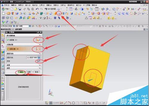 3 、对完成草图的模型进行“分割面”的操作。首先点击工具栏中“分割面”的小图标,在弹出的数据框中选择有草图的其中一个面,选择长方形草图的四条边,指定分割的方向,最后点击“确定”,完成其中一个面的分割。另一个面的分割操作步骤相类似,在这里就不在说明了。