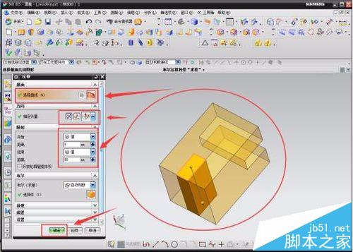 4 、分割面操作完成后,就开始对模型进行拉伸的操作和边倒圆的操作。点击左上角工具栏中的“拉伸”小图标,在弹出来的数据输入框中选中分割面后的长方形的四条边,选择向模型内的方向,开始值为0,结束值为80,布尔值为“求差”,最后点击“确定”。完成其中的一个拉伸操作,另一个拉伸操作的原理及步骤相似。得到拉伸完成后的模型,点击工具栏中“边倒圆”的小图标,分别选择其中一端被拉伸后的棱边,形状为圆形,边倒圆的半径为40,点击“确定”。再重复该操作一次,最终的到一个新的模型。