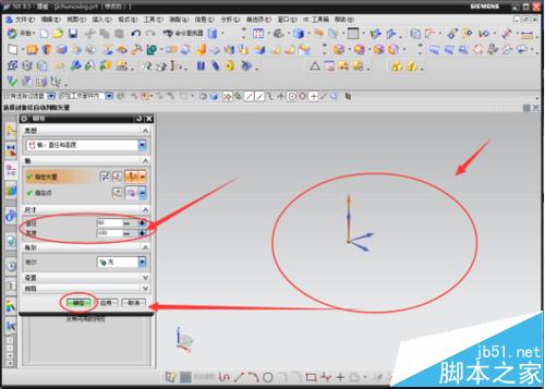 3 、点击“圆柱体”选项后,在页面的模型建立区域中会有一个坐标系。在页面的左边会弹出一个数据输入的设置对话框。暂时不改变“指定矢量”和“指定点”的默认设置。现将尺寸设置中的直径设置为60,高度设置为100(系统默认单位为毫米mm),其他的都不更改,点击底下的“确认”。