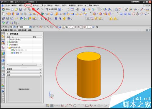2 、点击“确认”后进入到“jichumoxing ”模型文件编辑模型建立的主页面。在菜单栏中找到“插入”的菜单,然后选中并单击。在弹出来的一列子菜单中,找到“设计特征”菜单选项;选中后又会自动弹出另一个子菜单,在菜单中找到的“圆柱体”的选项,并单击。