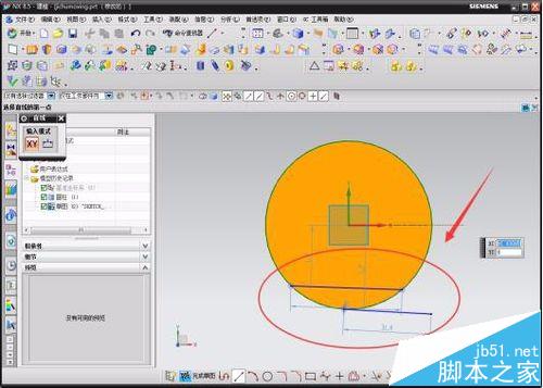 4 、点击菜单栏中“插入”菜单选项,在弹出来的子菜单中选择“草图”选项。此时会在左边的数据输入区域中弹出一个设置窗口,点击一下“选择平的面或平面”后的小图标,选中圆柱体的上底面,选中后点击“确认”。此时圆柱体的底面就会平行窗口,只看到一个平面,转动鼠标滚轮,调整模型适应窗口的大少视图,以方面草图。点击草图功能区中的“直线”工具,随意在圆柱曲线上点击一下确定点,再在另外的圆边上点击;接着在小圆弧一段内的弧线点击,作另外一条平行的直线即可。作此草图主要是为后面的体切割提供“约束”选择。最后点击“完成草图”。