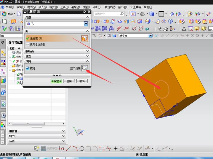 4、现在选择插入/同步建模/删除面,或者直接点出图标中的删除面命令,在类型中选择孔,如图所示,选取要填充的孔的面。预览特征,点出确定,效果如图。