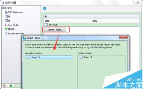 2、单击选择“表”选项卡,在此您可以单击“Select Tabels...”,添加或删除要使用的数据库中的工作表。