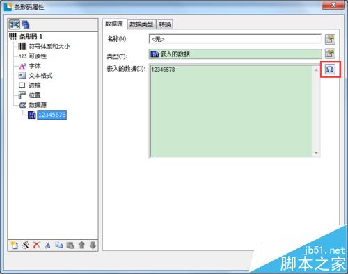 1、在BarTender 2016中双击创建的条码,打开条码属性对话框,单击数据源选项卡,点击嵌入的数据源右侧的“插入符号或特殊字符”按钮。