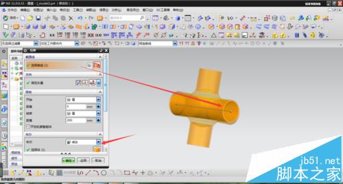3、选择拉伸命令,选取一条管道的内孔边,拉伸长度为200,布尔运算为减去,使用管道生成中间通孔特征。同样的方法拉伸另外两个管道边缘,将所有管道贯通。