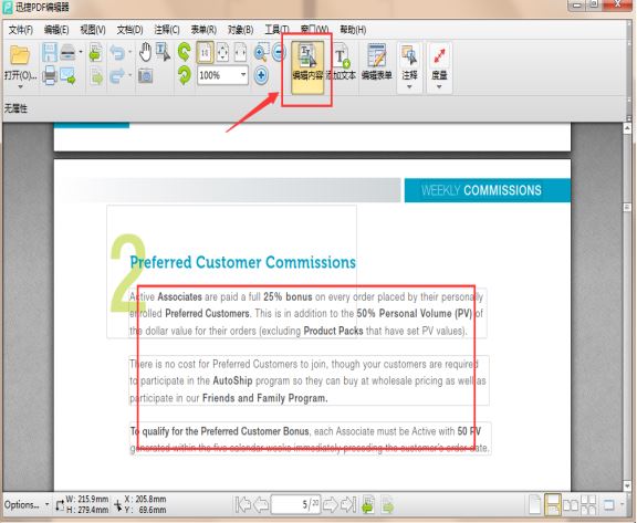 3、点击“编辑内容”,就是可以修改里面的文字和调整字体格式大小了。也可以直接删除,也可以对字体的颜色,大小、效果等,进行设置。实现了对现有PDF文件内容的重新编辑。