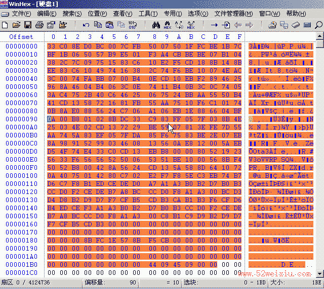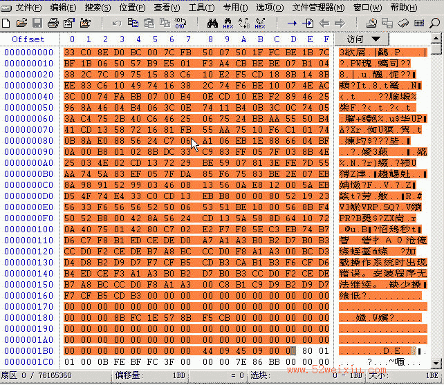 首先恢复引导代码,这最简单了,只要用Winhex到别的系统盘把引导代码复制过来就行了。我现在的机器上不是挂着两个硬盘吗?一个迈拓2G,一个西数40G,西数40G是我的系统盘,那就从这个盘上复制就行了。