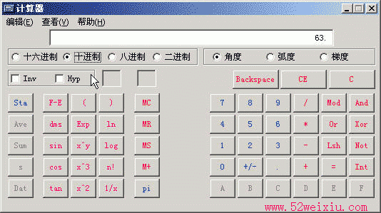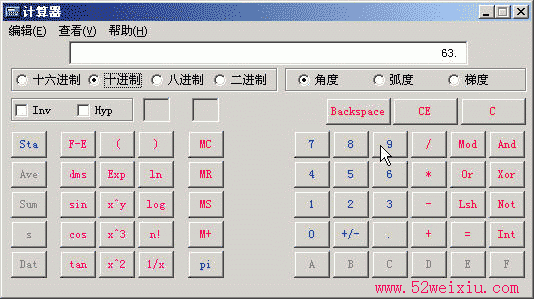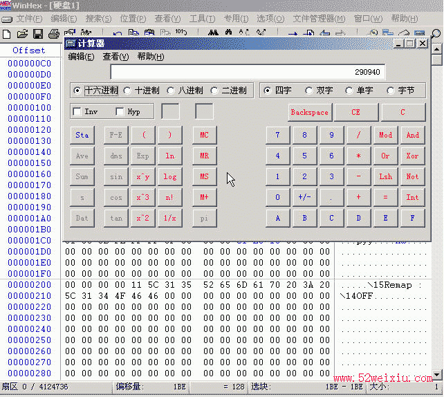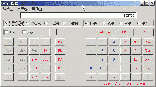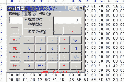 第9、10、11、12字节 系统隐含扇区3F 00 00 00:所谓系统隐含扇区就是本分区(C盘)之前已用了的扇区数,这是一个十六进制数,但要注意:真正的隐含扇区数应该反过来填写(比如:隐含扇区数为3E 4D 5A 6F,则反过来就是6F 5A 4D 3E ,这才是实际的隐含扇区数)。那么,3F 00 00 00反过来写就是00 00 003F,也就是3F,将他转成十进制数我们才能知道实际的隐含扇区数是多大。这可以使用计算器来算,单击工具栏上的“计算器”按钮,如下图: