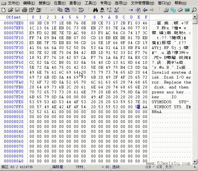 首先找到第一个“55AA”,我们看到,个扇区在第63个扇区上,并不是我们要找的EBR,再按F3继续查找