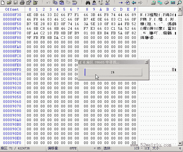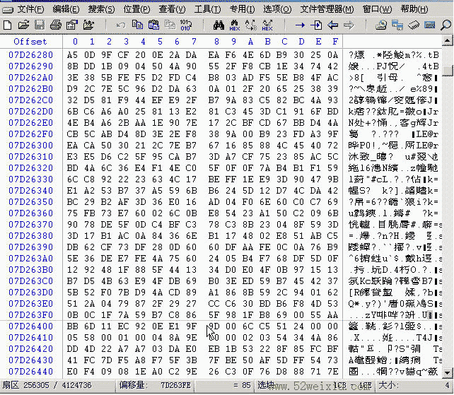 我们来通过具体的例子看一看已加密或无明显特征字串的情况(这是最通常的情况)。以一Office文档的恢复为例。