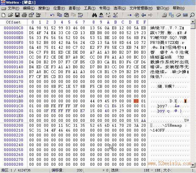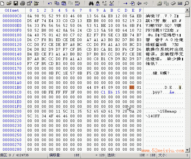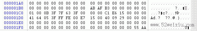 下面,我们就开始恢复分区表(共64个字节,分为4个分区表项,每个分区表项占用16个字节,一般只使用前两个分区表项),我们首先来恢复第一个分区标项(也就是用来描述C盘的)。
