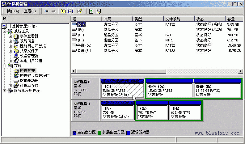 出现一个对话框,选“磁盘管理”,在右边可以看到磁盘一的三个分区(Fat32、Fat16、Ntfs)全部都回来了,至此,手工恢复分区表顺利完成。