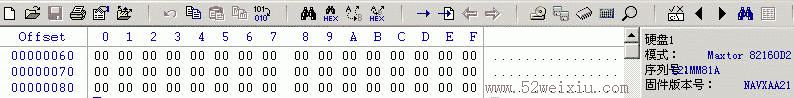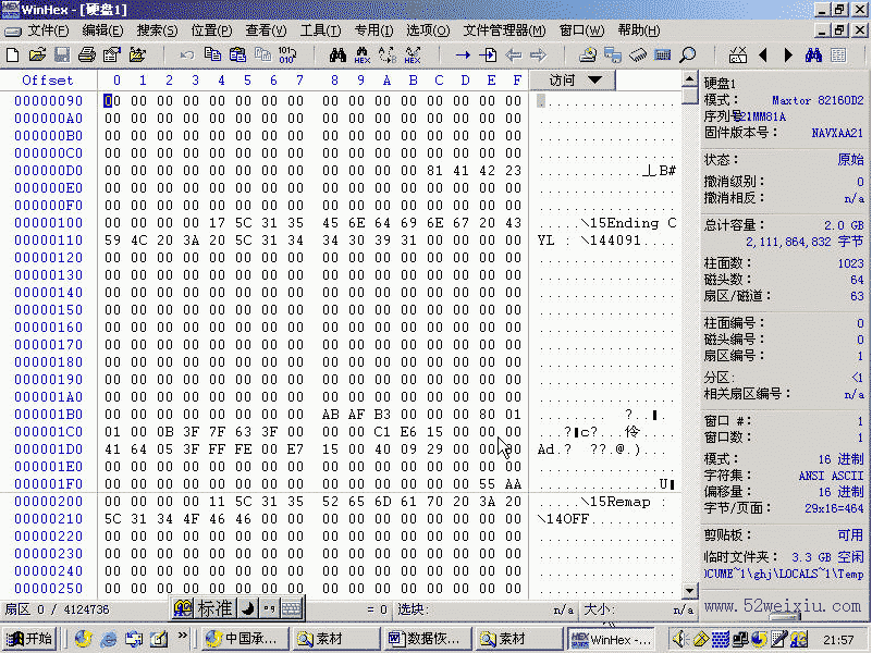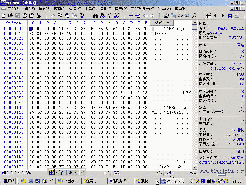 在这个对话框里,我们可以选择对单个分区打开,也可以对整个硬盘打开,HD0是我现在正用的西部数据40G系统盘,HD1是我们要分析的硬盘,迈拓2G。这里我们就选择打开HD1整个硬盘,再点确定.然后我们就看到了Winhex的整个工作界面。