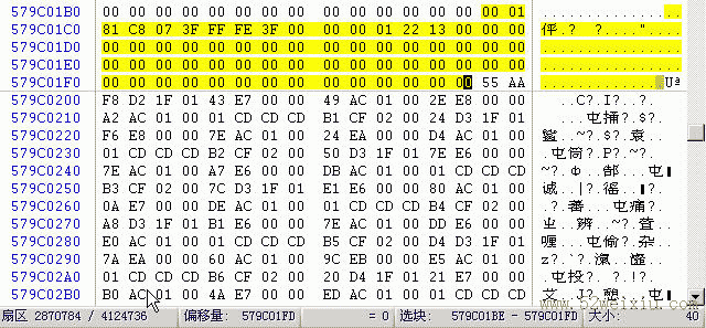 第13、14、15、16字节是本分区的总扇区数,也就是C盘的大小,这就要通过稍微一点点计算来得到了。因为C盘是从第63个扇区开始,而C盘后面紧接着的是EBR,所以用EBR所在的第一个扇区数减去63就是C盘的大小。那么如何才能找到EBR所在的第一个扇区呢?我们前面说过,EBR的结构和MBR是一样的,所以,EBR的结束标志也一定是55AA,那么,只要我们找到这个结束标志,再看看这个扇区是不是EBR不就行了?