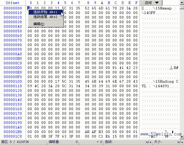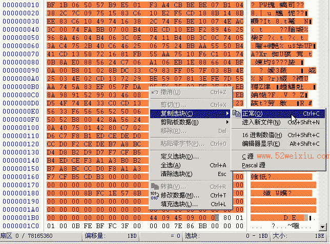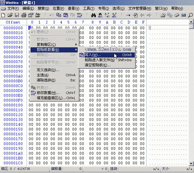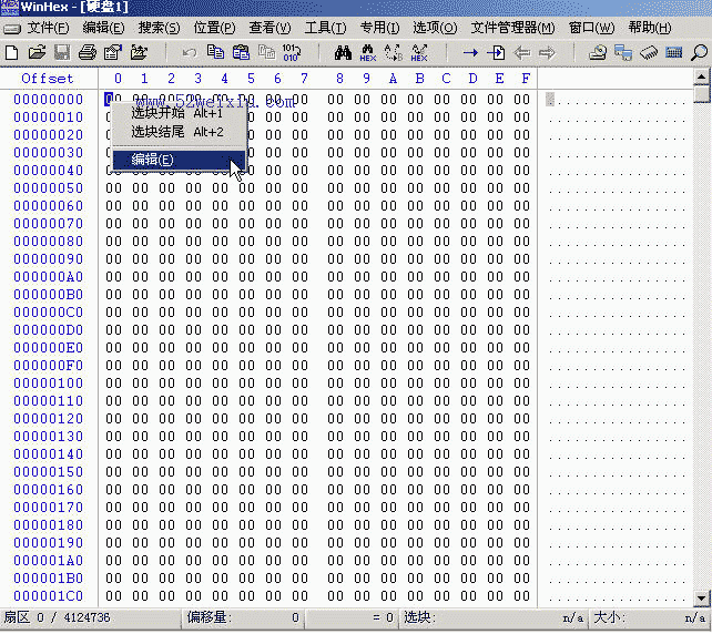 然后我们切换回硬盘1窗口,在零扇区的第一个字节处单击鼠标右键,选“编辑”
