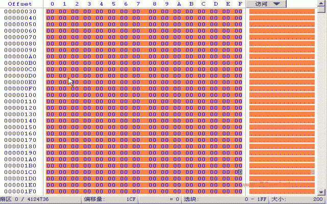 向下拉拉滚动条,可以看到一个灰色的横杠,每到一个横杠为一个扇区,一个扇区共512字节,每两个数字为一个字节,比如00。